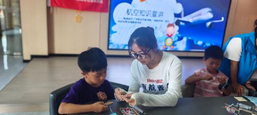 (图13)实践队员在进行航空知识科普 (图14)实践队员在教小朋友们做航模