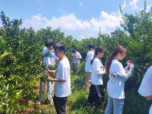 绿色产业兴乡村:科技赋能助农增收 实践队深入南丰县现代柑橘产业科技示范园,开展“知行合一助振兴 蜜桔飘香誉九州”主题活动。南昌航空大学航空宇航学院党委书记江凡、副书记万勇平及南丰县团委书记唐丽华亲临指导。高级农艺师王泽义详解蜜桔千年种植史、智能栽培技术与全产业链现状,队员们围绕科技赋能、产业融合等议题交流。烈日下,队员们分组参与精准施肥、枝条修剪,在实践中体会农业精细化管理的重要性。总结会上,书记们送上慰问品,叮嘱队员以专业助力乡村振兴。