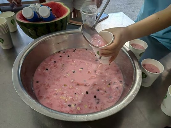 餐毕,后勤组的成员们早已备好惊喜——自制的西瓜椰椰饮品。冰爽的椰汁滑过喉咙,带着西瓜的清甜与椰果的Q弹嚼劲,一口下去暑气全消,队员们喝得眉眼弯弯,连连拍手叫好,幸福感在舌尖悄然蔓延。