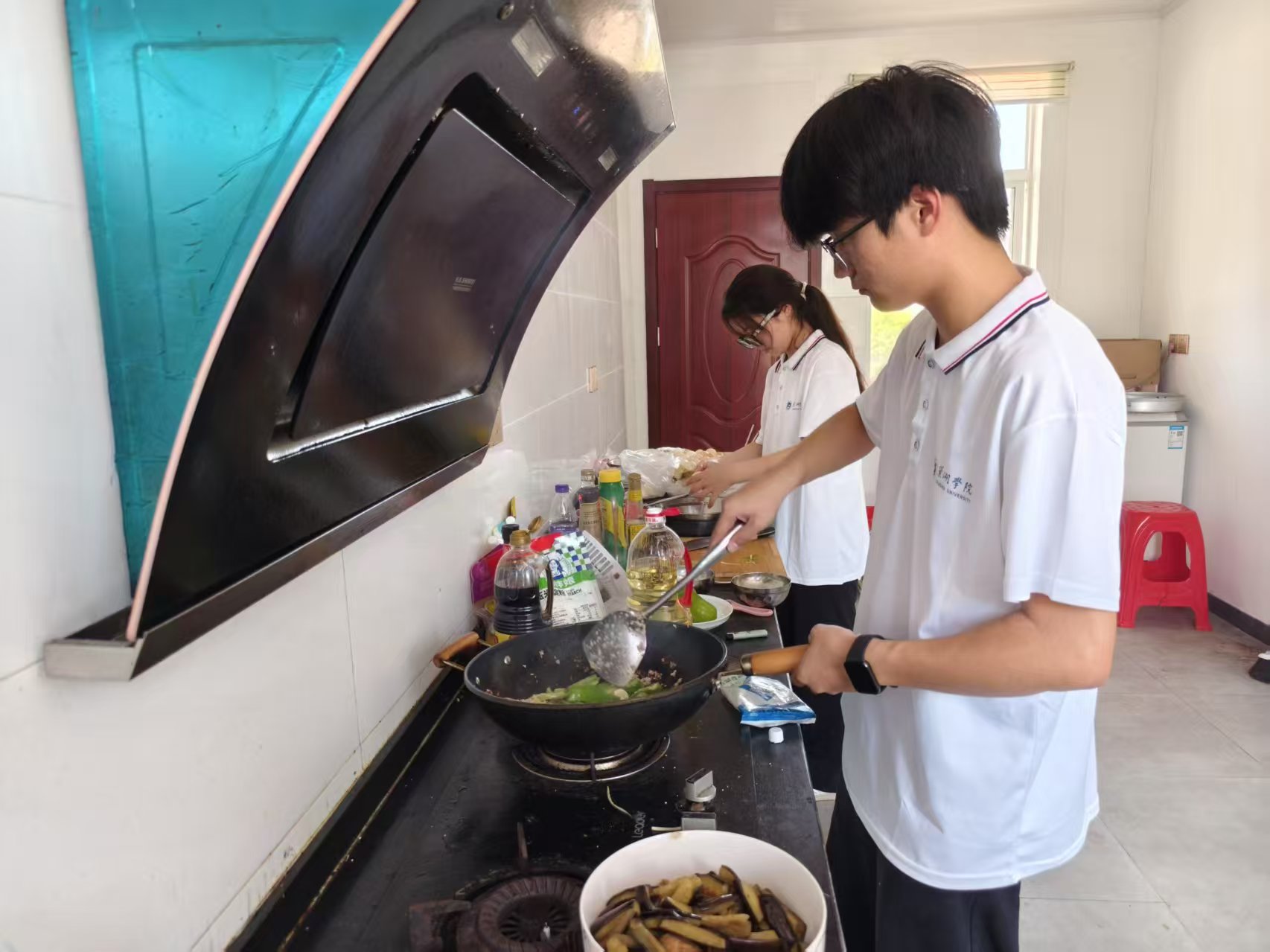 当孩子们在课堂上汲取知识时,厨房内也是一派忙碌景象。志愿者王雨乐和叶娜化身“爱心厨师”,精心为孩子们准备营养午餐。一道道美味菜肴,承载着志愿者对孩子们的深切关爱与呵护。