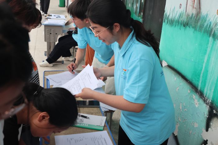 报名环节随即展开,家长带着孩子围在桌前,认真填写学生基本信息、家长承诺书、学生承诺书。这一环节既是安全保障,也为支教团快速了解学生、拉近关系搭建了桥梁。针对年迈的爷爷奶奶带低年级孩子报名时的困惑,志愿者及时上前讲解,协助完成填写。报名结束后,支教团成员仔细核对信息,更新名单,为次日开课做足准备。