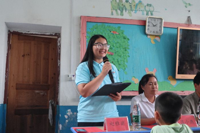 河海大学红色筑梦支教团的领队赵雅丽详细介绍本次支教活动的基本情况、课程安排、教学目标以及安全注意事项。她代表全体团员作出承诺:在点亮青春、服务社会的生动实践中,担当时代使命,弘扬“吃苦耐劳,真抓实干”的精神,将汗水挥洒在乡村教育的沃土上,以实际行动为茶陵孩子们的成长贡献一份绵薄的青春力量。