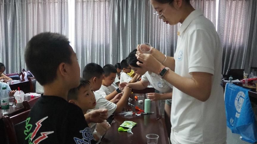图为实践团成员帮助小朋友进行“生气的河豚”实验 吴思逸摄