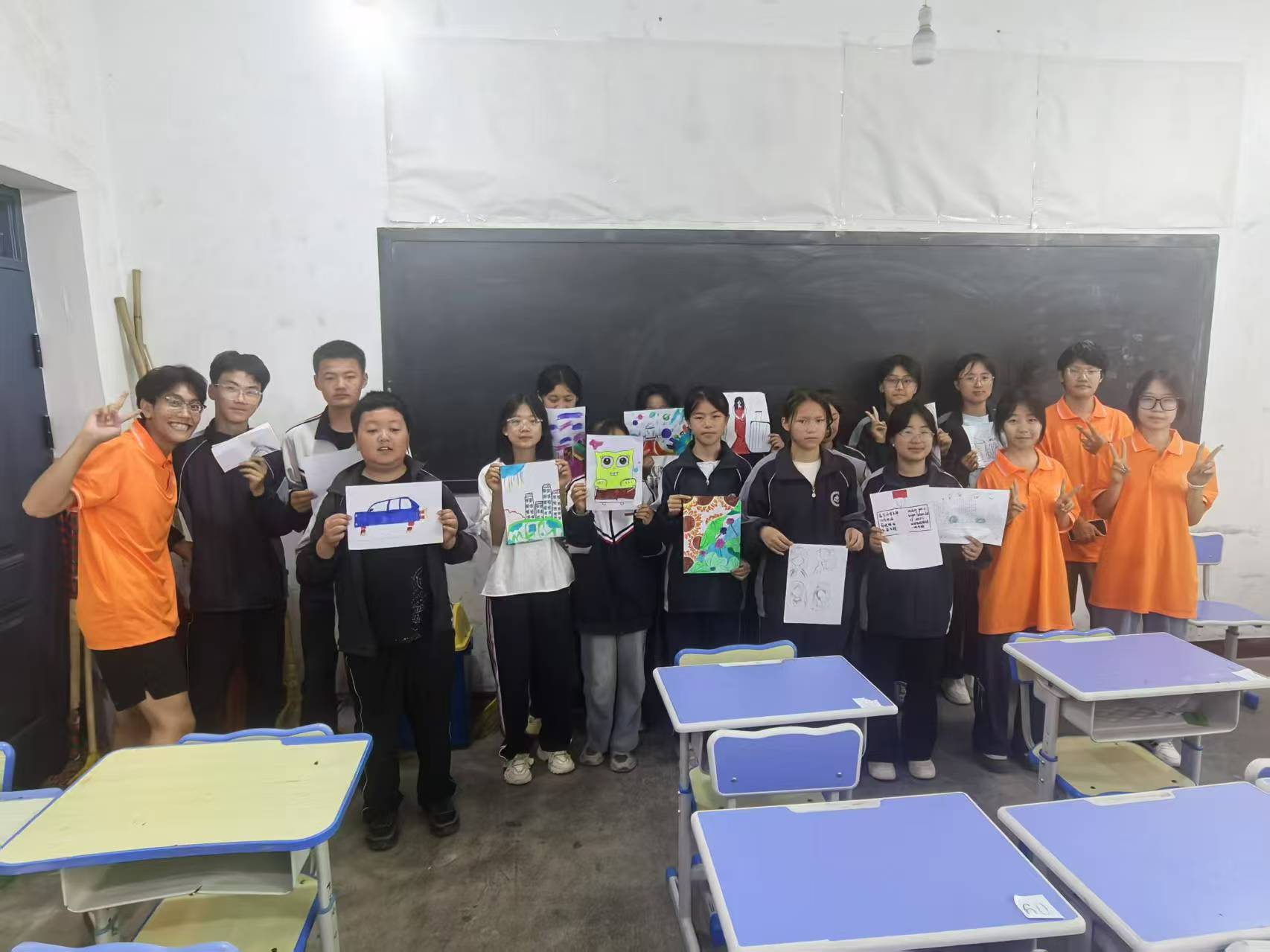 图为志愿者们与东乡中学小同学以及他们的作品合影(杜骞 摄)