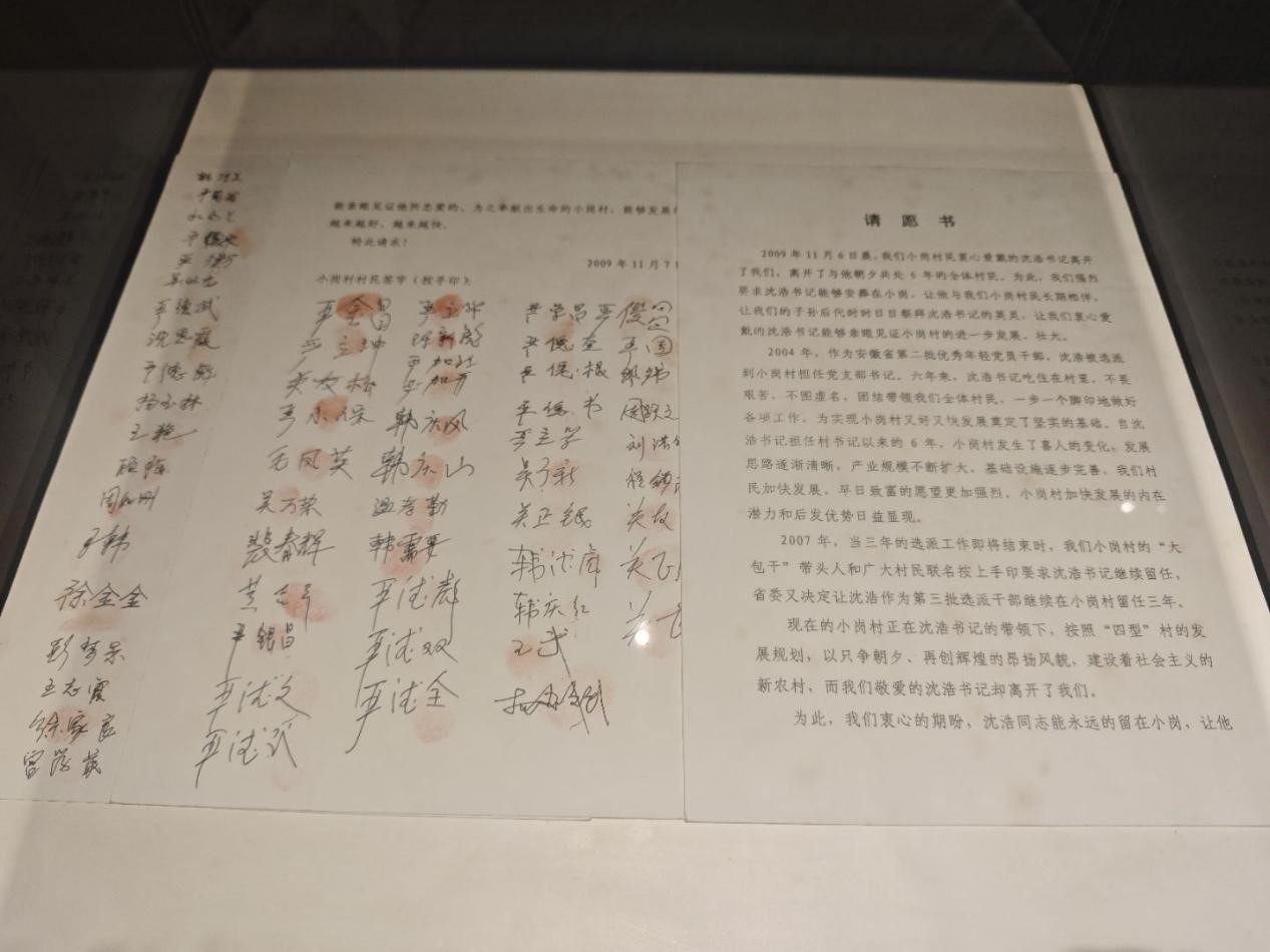 陈列馆里,三组特殊的红手印拓片静静陈列,无声诉说着跨越时代的奋斗故事。1978年,小岗村18户村民在“生死契约”上按下的红手印,撕开了中国农村改革的序幕;而沈浩同志扎根小岗村的岁月里,村民们又先后两次以红手印挽留他,在他因公殉职后,更以第三次红手印请求将其骨灰安葬于此,让他永远守护这片土地。