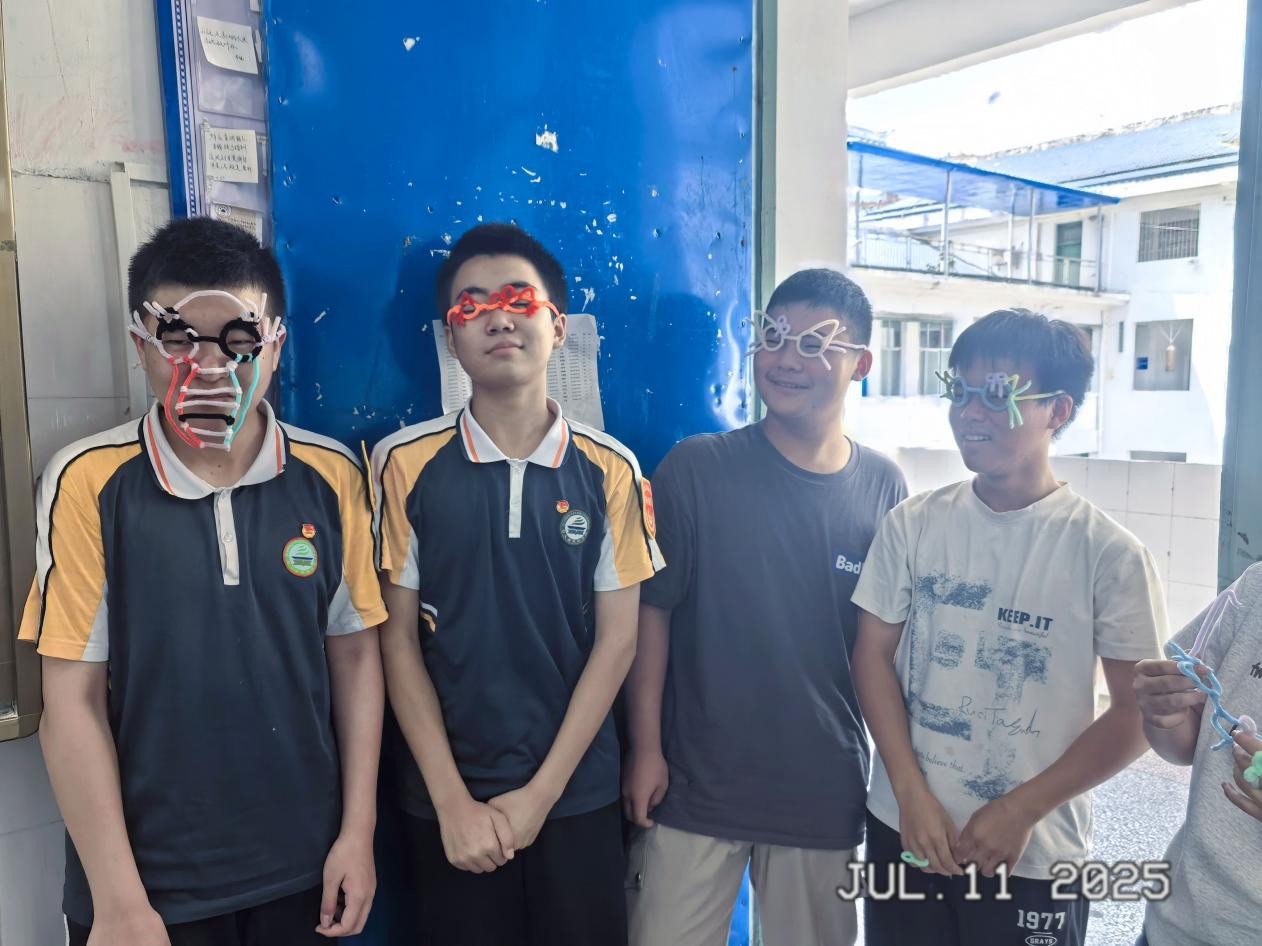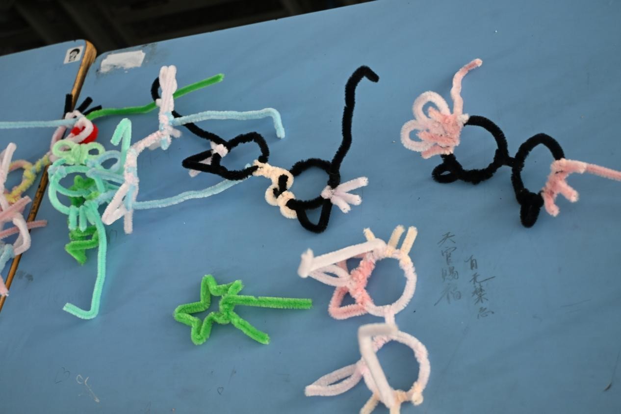 学生们听得聚精会神,拿到材料后立刻行动起来。有的同学选择用紫色和粉色扭扭棒搭配,做出了一副充满少女心的镜框;有的则大胆尝试不规则形状,让眼镜看起来个性十足;还有的在镜腿上加上了小花朵、星星等装饰。制作过程中,大家遇到难题就主动向促进团成员请教,成员们也耐心地逐一指导。八年级的龙浩宇举着自己制作的“超人眼镜”,自豪地说:“这是我发明的款式,戴上它感觉自己特别酷!”