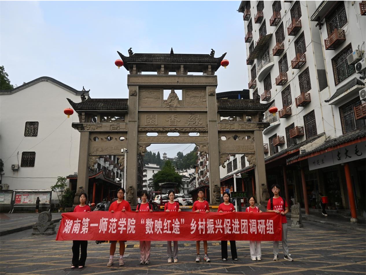 2025年7月12日,湖南第一师范学院“数映红途”乡村振兴促进团奔赴古丈茶市,开启乡村振兴调研实践。清晨的“绿香园”牌坊下,团队成员身着统一队服集结,以青春之姿投身茶乡发展探索。