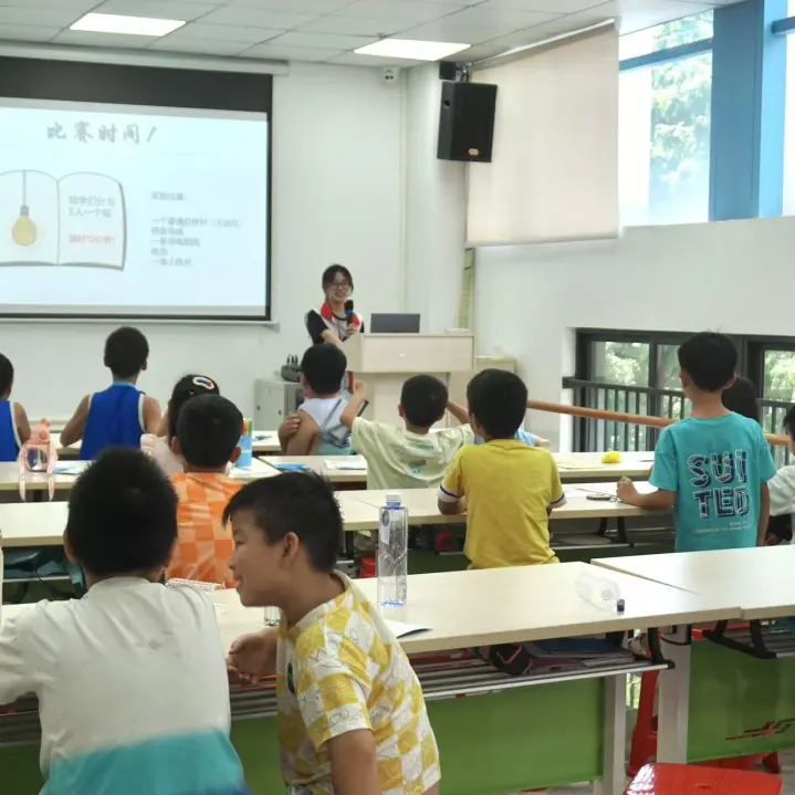 在了解完理论的知识后,授课老师安排了分组实验比赛,用“寓教于乐”的方式,让小朋友们化身“小小科学家”,五人一组合作制作电磁铁,限时10分钟,利用铁针、导线、电池和小铁片制作简易电磁铁,比赛哪组能最快将小铁片从一个杯子移到另一个杯子。实验过程中,同学们团结协作,严格遵守安全规则,现场气氛热烈。