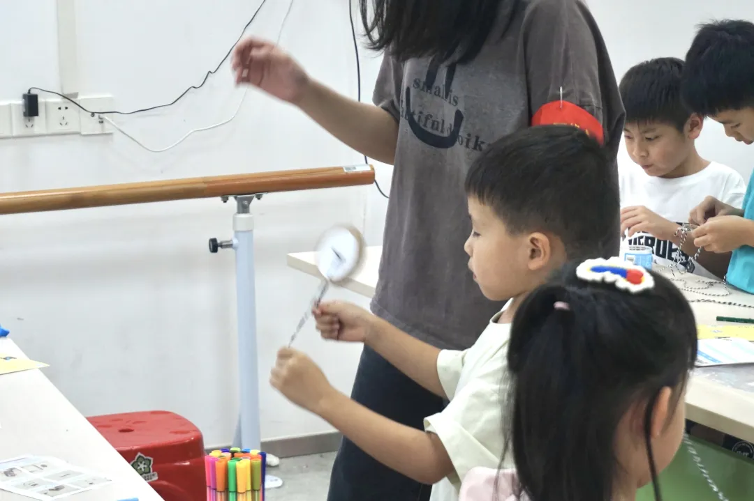 为积极落实“百千万工程”,丰富社区儿童的暑假生活、助力社区儿童身心健康发展,2025年7月15日,华南师范大学物理学院四进永和服务队队员郑点走进广州市黄埔区永和社工服务站,为小朋友们带来富有童心童趣的“玩具总动员之拉线飞轮”活动课。
