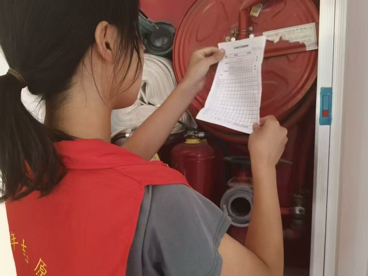 7月24日,团队成员在物业张师傅带领下,携带登记表与工具包进入各居民楼。每到一层,大家便仔细核查消防栓箱门是否完好、水带有无破损、压力表指针是否在绿色区域,同时记录灭火器的生产日期与压力值。6栋居民楼、2处活动广场,28个消防栓、42具灭火器,逐一登记在册。排查中发现3号楼2层消防栓箱门合页松动、5号楼1层水带接口轻微老化,当即拍照记录并反馈至维修组,张师傅在一旁感慨:“这些细节平时容易忽略,多亏你们细心。”