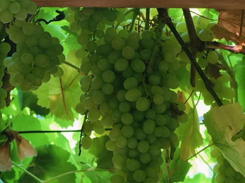 (图为葡萄沟种植园内成熟的葡萄串,晶莹剔透的果实挂满藤架)