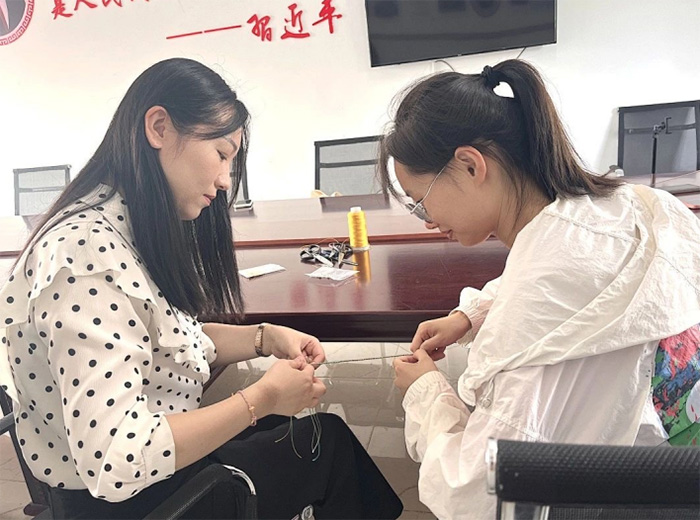 (图片5周铭铭书记指导队员编手链)