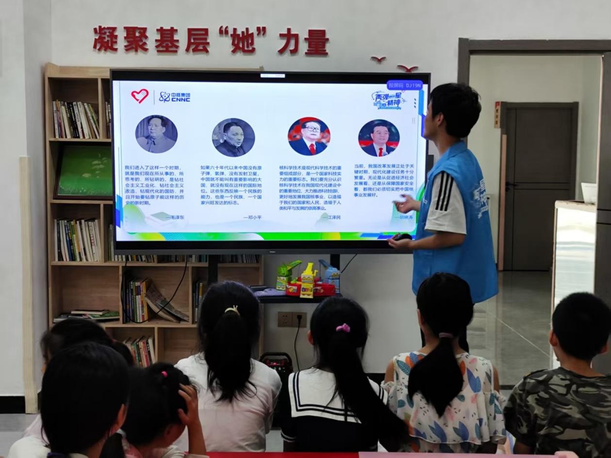宣讲伊始,志愿者紧扣“党领导”这一核心,以新中国建立初期的国际环境为背景,清晰地阐述了党中央作出独立自主发展核工业战略决策的重大意义。志愿者以生动有趣的语言打开孩子们的认知大门,从核工业起步时的艰难环境,到如今的辉煌成就,孩子们的注意力被紧紧吸引,在聆听中体会一代代核工业人“无私奉献、勇于登攀”的精神,感受党在核工业发展中始终如一的引领与担当,让爱国之情在互动中悄然萌芽。