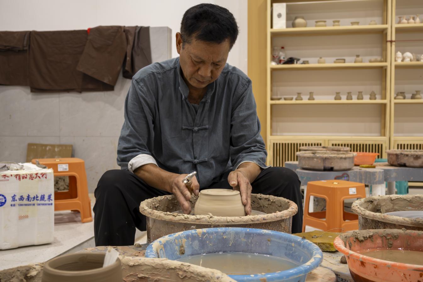团队刚进入工作室,拉坯机的转盘正平稳转动。一位老师傅俯身坐于转盘前,双手沉稳覆于陶泥之上——这正是沅河黑陶制作的关键环节“手工拉坯”。老师傅掌心贴泥轻按,陶泥顺势凹陷出匀称弧度;随转盘旋转,双手缓缓上拉,陶泥渐升,初具器形轮廓。整个过程中,老师傅动作从容,每一次按压、拉伸都恰到好处,既体现对力道的精准掌控,又彰显深耕此道数十载的深厚功底。