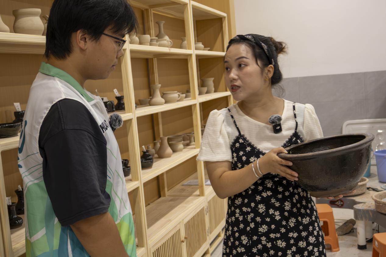 7月13日上午,湖北汽车工业学院“拾遗楚韵·启为创新”非遗调研团队前往湖南省怀化市五溪非遗园,拜访了沅河黑陶传承者——邱超老师。在陈列着琳琅满目的沅河黑陶展品的工作室里,团队调研了这门技艺的传承与创新;在老老少少围坐体验制陶技艺的空间中,与邱超老师深入交流,感受她守护这门技艺的坚守与执着。