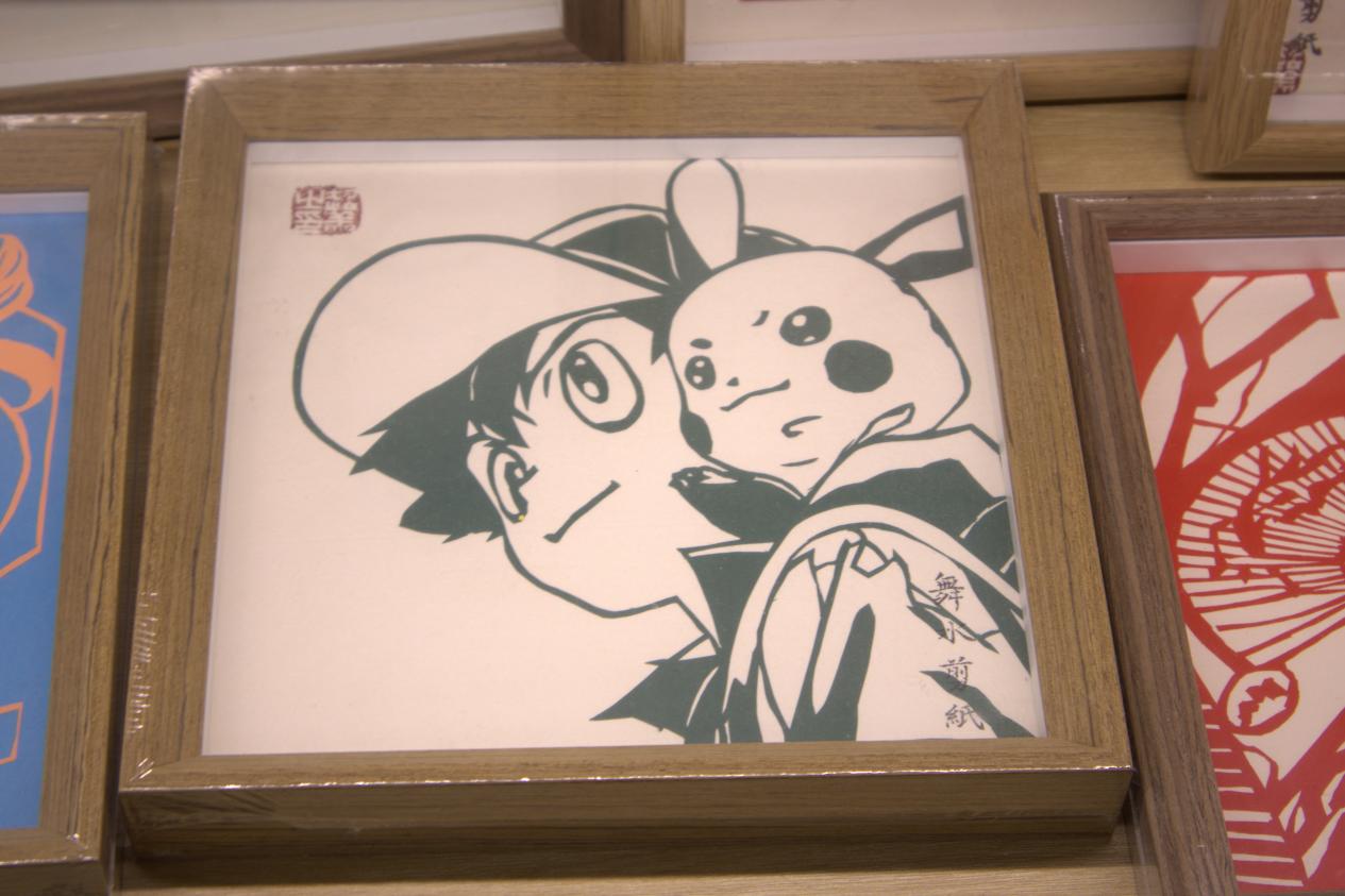 邬金设计的《精灵宝可梦》剪纸同样引人注目,她运用传统阴刻技法刻画皮卡丘和人物帽檐,作品上“舞水剪纸”的落款彰显了现代与传统的结合。还有根据经典画作改编的毛泽东侧影剪纸,阳光透过红纸,伟人轮廓清晰。邬金提到,年轻人喜欢用剪纸记录时代符号,因此他们融入红色记忆和动漫形象,让剪纸艺术适应多样生活场景。