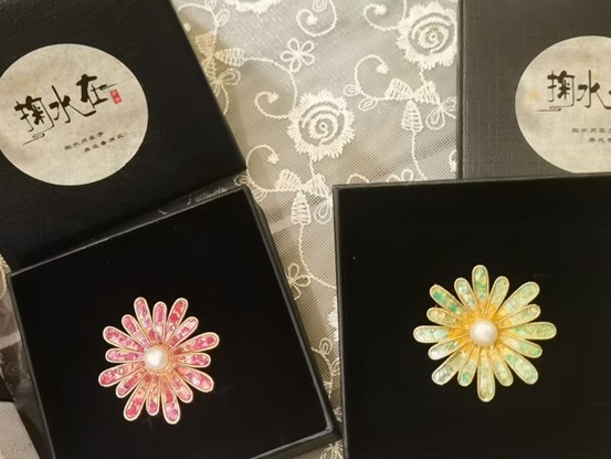 采访中,屈敏老师带团队来到展柜前,介绍自己的得意之作。展柜里的绒花作品形态逼真、色泽雅致,让队员们惊叹不已:蚕丝在铜丝骨架上堆叠出立体花型,层叠中藏着自然的生长韵律;每一缕绒毛都舒展服帖,转折处不见丝毫杂乱;近观可见细节巧思——一朵极小的梅花,绒丝细如蜂腿,却将花瓣的娇嫩感展现得活灵活现。