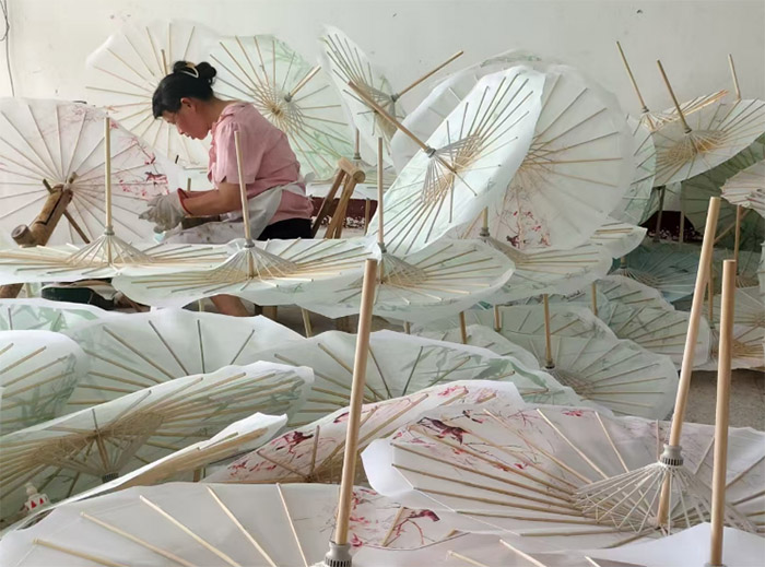 从楠竹种植到桐油炼制,从棉纸生产到金属配件,全镇百分之七十三的劳动力投入到了油纸伞生产的产业链中。