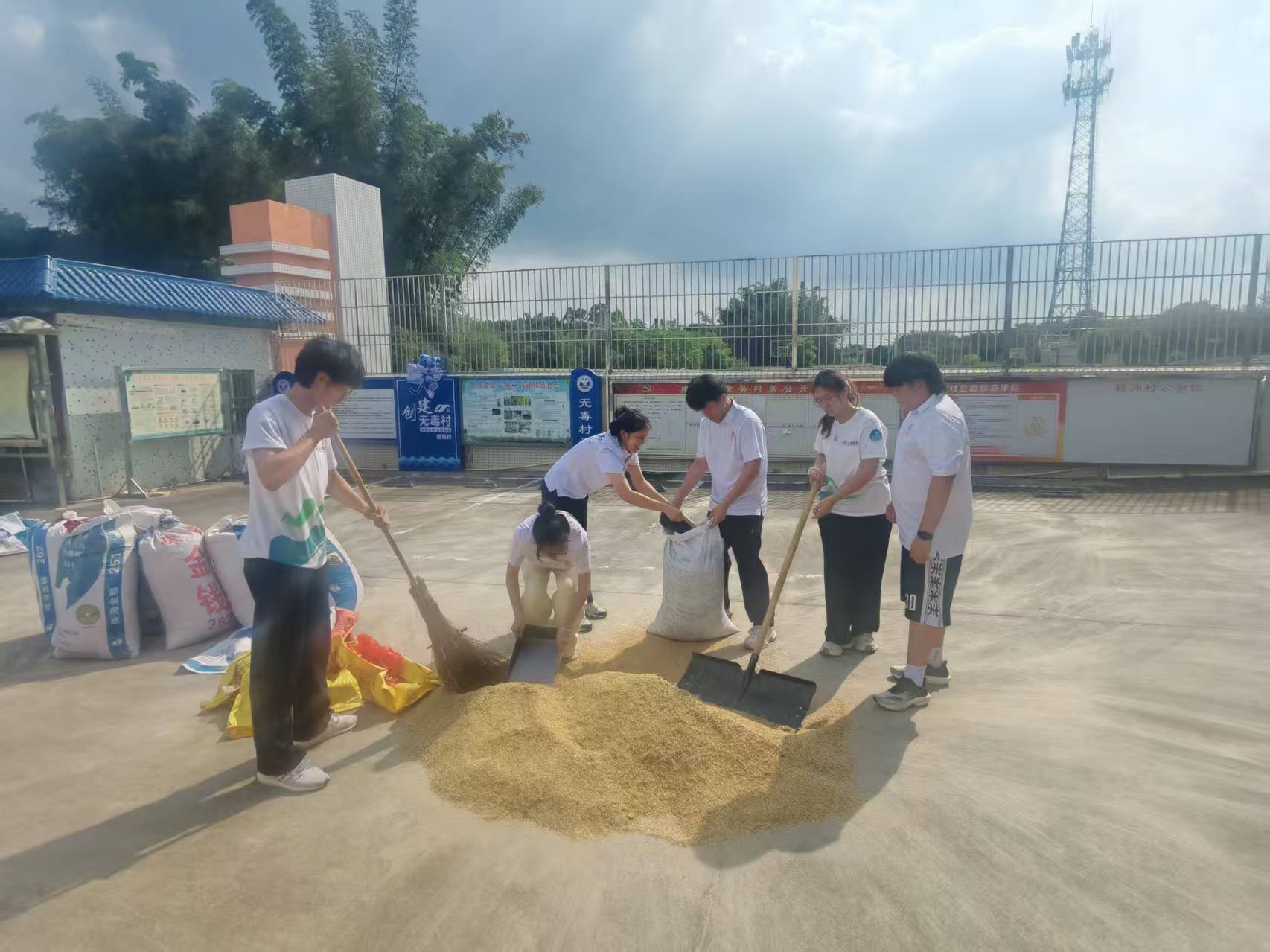 突击队将楼角村村委会化作“助农学堂”,以抖音运营为基础切入主题,再聚焦直播实操与数据复盘,手把手教村民带货技巧,队员们在“助农学堂”完成了知识传递的接力。而当在培训结束后,看到两位老人正在抢收稻谷,用汗水帮村民抢收粮食,或许是更生动的“实践课”。于是,队员们拿起扫帚、铲子俯身奋战,一头扎进晒谷场,将金灿灿稻谷归袋,用实干诠释青春助农的另一种模样。从知识赋能到实干助农,青春力量在乡村土地上,以研学为笔、实践为墨,书写新时代青春助农答卷。
