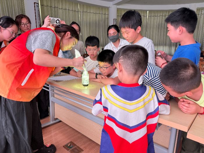 世纪家园社区爱心暑托班内,孩子们围在队员吴嘉彦身边,看她用一杯水、一点维生素C和手电筒妙手生花。“看,这是咱村里才有的星空!”孩子们纷纷感叹。她随即带孩子们吟诵描绘田园乡村的古诗,讲述村里的故事和传下来的手艺。