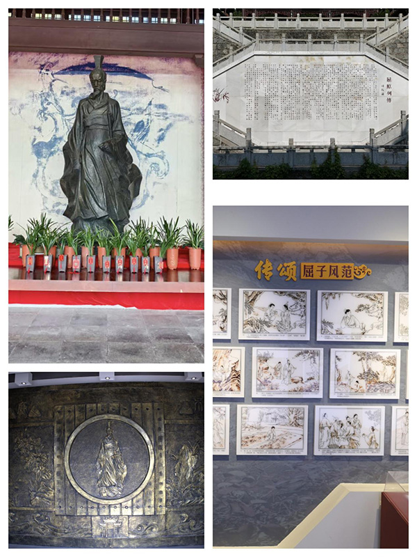 《屈原列传》碑刻如凝固史卷,静静诉说屈原生平与精神;巍峨屈原雕像,以长袍广袖、凝重面容,彰显其忧国忧民的孤高品性;“传颂屈子风范”连环画展,用“读书洞”“濯缨泉”等故事,将屈原人格魅力化作具象画面;主题浮雕则以圆形构图、“廉”字环绕与山水莲花点缀,艺术化凝练屈原精神内核。