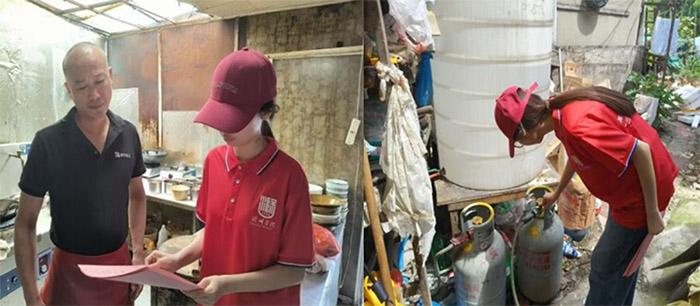 6月26日到6月27日,学子们化身安全“监督员”,对金港湾社区和向荣社区餐饮单位开展全方位隐患排查。重点检查煤气罐使用年限、阀门密封性、存放环境合规性等燃气安全细节,同步核验灭火器压力值、摆放位置、有效期等消防设施状态,确保硬件设备符合安全标准。排查现场,团队成员通过“案例讲解+手册发放”的方式,向从业人员系统普及燃气规范操作、火灾初期扑救、日常自查要点等知识,着重强调“隐患即事故”的风险意识,推动经营者主动落实安全主体责任。此次行动为社区居民筑牢了餐饮安全防线,也为后续社区建立常态化检查机制提供了实践参考。