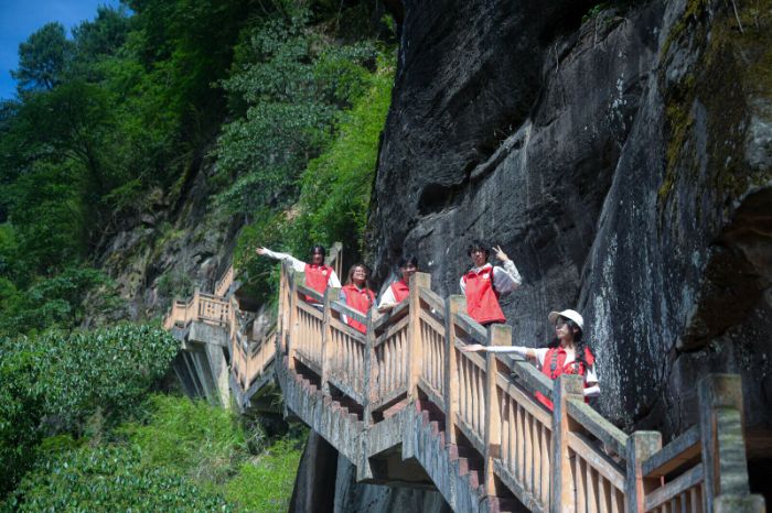 活动伊始,志愿者们来到老瀛山进行采风。老瀛山以独特的丹霞地貌、恐龙足迹化石群等地质而闻名。志愿者们徒步攀爬丹霞长廊,穿梭在沟壑和山峰之间,领略着大自然的鬼斧神工,近距离观察恐龙足迹化石,更加进一步了解了红岩村的地质文化底蕴。