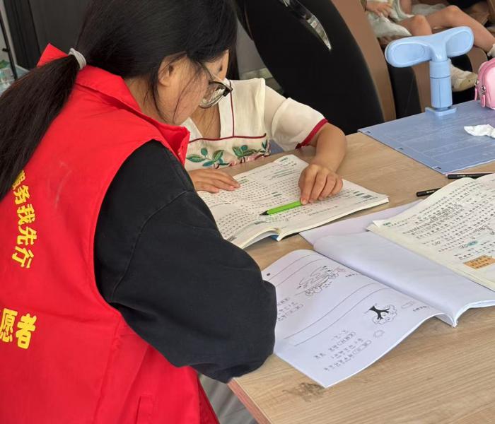 在温馨的室内环境里,一位志愿者,正专注地辅导孩子做作业。孩子坐在一旁,认真跟着志愿者的讲解思考。桌上摊开着课本与练习册,满是知识的印记。还有孩子惬意地躺在按摩椅上,整个场景传递出温暖的互助氛围,彰显着志愿服务助力学习、传递关爱的意义 。