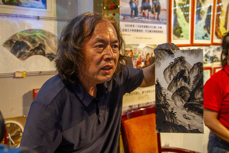 探访过程中,习老师现场为我们展示了指墨画的创作过程。只见他指尖蘸墨,在宣纸上或点或抹,短短十余秒,一幅栩栩如生的“巫山”便跃然纸上。随后题写的"曾经沧海难为水,除却巫山不是云"诗句,更让画作意境深远。