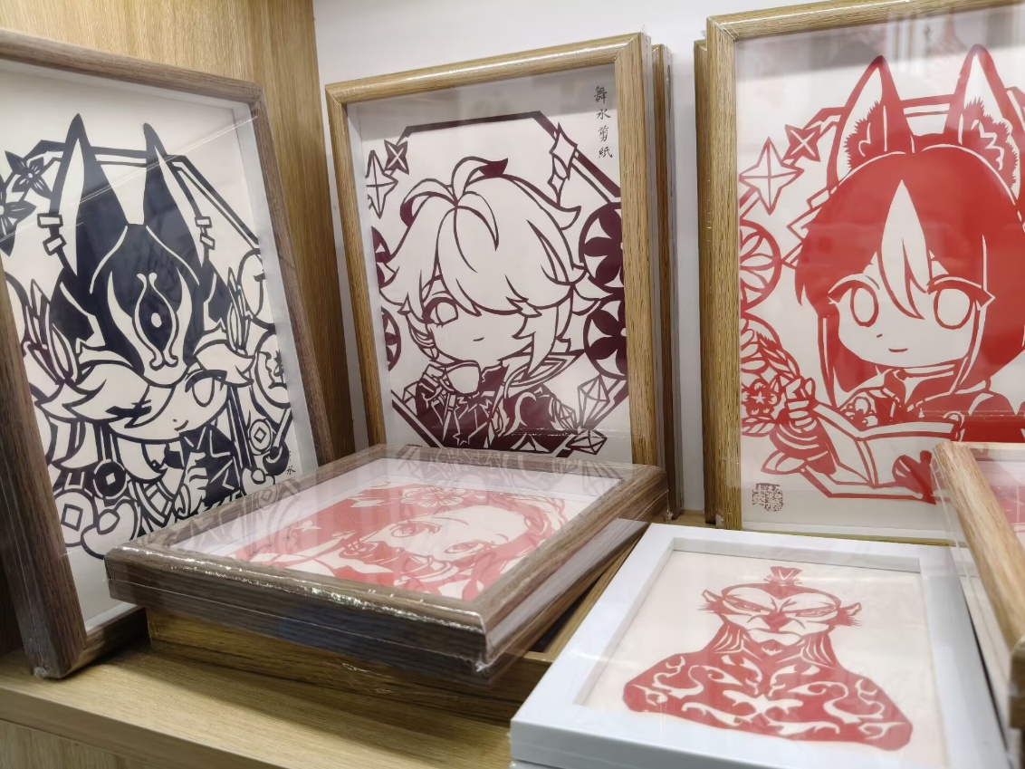 在手意草堂剪纸工作室,第四代传承人邬金的刻刀下,传统纹样与二次元世界正奇妙共生。一张普通的红纸,在她手中经历画稿、镂刻、熨平的繁复工序后,竟跃出了栩栩如生的国漫角色。团队调研时目睹,她与母亲袁超美伏案协作:母亲指尖在纸稿上规划下刀路径,女儿屏息凝神,刻刀游走如笔,毫厘之间剔除冗余,让流行文化符号在传统剪纸中“活”了起来。