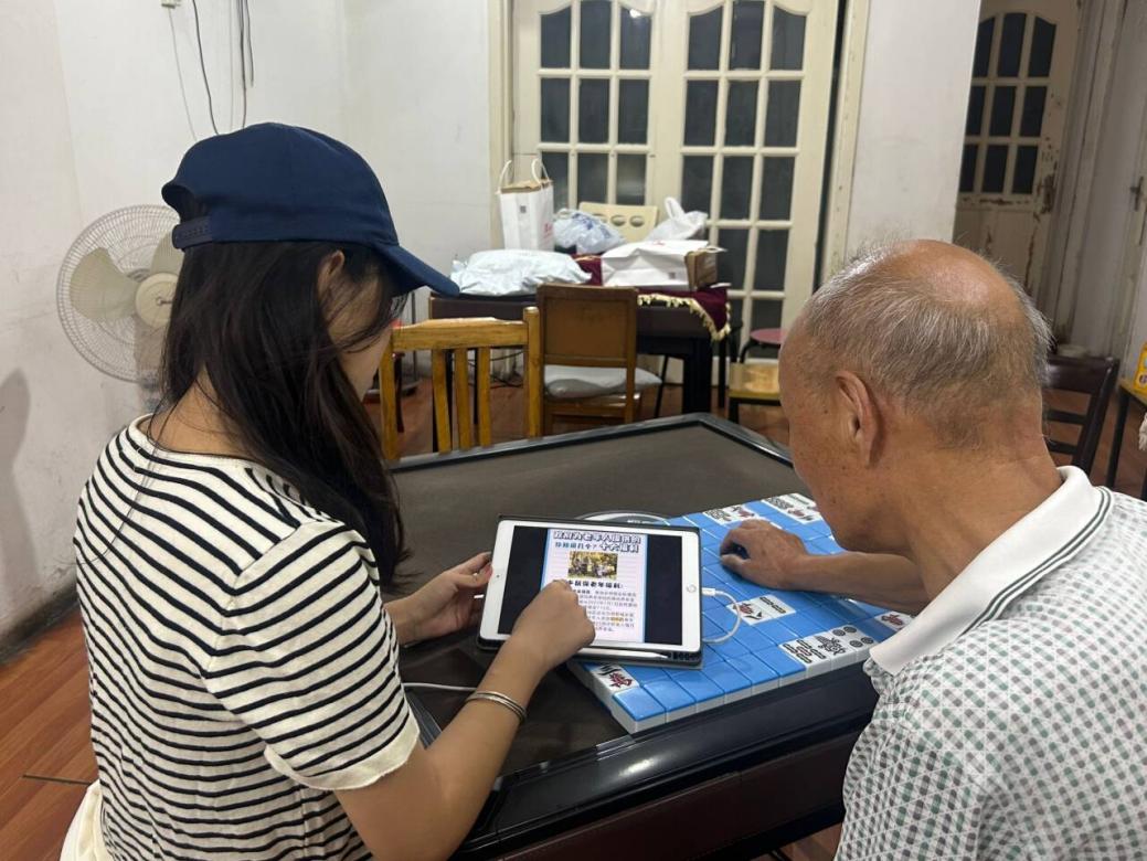 图为团队成员向李大爷讲解养老政策宣传方案(胡安琪 供图 )