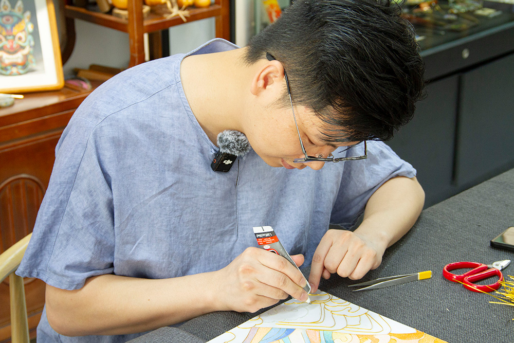 图为包钦老师正在专心制作掐丝珐琅作品。张佳怡通讯员摄