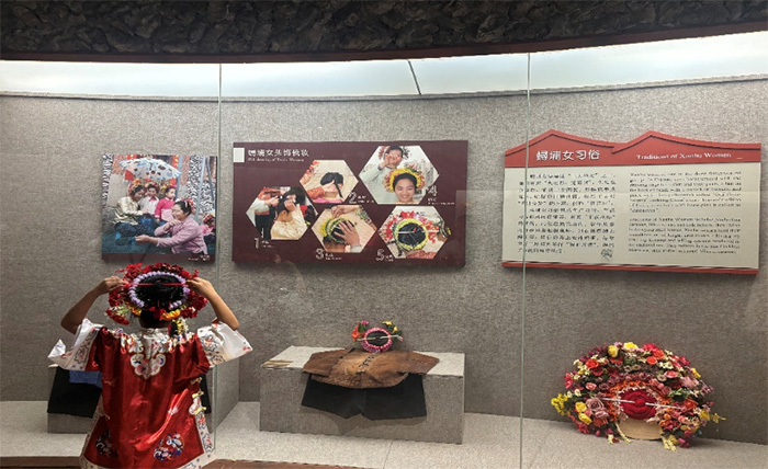 当目光聚焦到蟳埔簪花文化展区,各式簪花头饰精致夺目,各色明艳的花朵错落排列,既透着渔家生活的质朴鲜活,又藏着传统美学的巧思。通过介绍,实践队队员们了解到簪花不仅仅是蟳埔女独特的装饰,更承载着渔家祈福平安的美好愿景,是海洋文化与民俗风情的生动融合。从早年渔家女的日常装扮,到如今成为备受青睐的文化符号,簪花在传承中不断焕新,让实践队员们真切体会到了非遗“古韵今风”的生命力。
