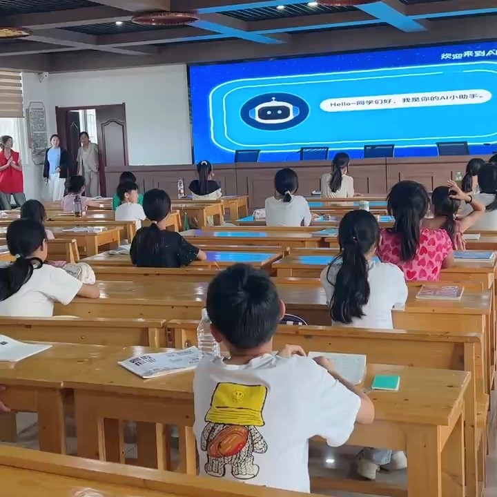 图为微光志愿者成员孙瑞琪通过一段AI的语音,激发孩子们对AI通识课的兴趣,随着“你觉得AI是什么?”的问题,伴随着一声声抢答,AI通识课拉开了序幕。祁议瑶 供图。