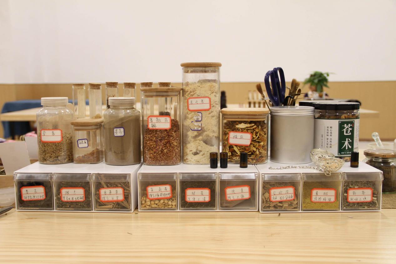 随后,蒋老师毫无保留地向团队展示了这款药香的制作全过程。她先播放了一段录制的制香视频,从选材时对野生香料的严苛筛选——必须是晨露未干时采摘的鲜材,到炮制阶段用古法蒸、晒、炙去除杂质,再到以石磨细细研磨成粉,直至按“君臣佐使”的医理配伍调和,每一步都透着对细节的苛求。视频结束后,蒋老师取出一碟刚从窖藏中取出的香粉,亲自演示后续工序:她将香粉轻轻铺在素白瓷盘中,置于案几上。微凉的穿堂风拂过,香粉在气流中缓缓舒展,而这一步就叫“醒香”。“就像好茶需醒茶,香也需与天地之气相融,才能释放本真。”蒋老师轻声解释道。香醒罢,再将其铺展在竹制香模中。指尖轻压间,香模上的云纹图案便在香泥上清晰浮现,纹路深浅随力度自然流转。成型的香品被小心收入带盖的紫砂壶中,她轻旋壶盖,留一道微隙让香气继续散开来。最后,她取来一小撮干燥的艾叶,以火引燃,待火星即将熄灭时,将其轻触香包一角。只见一缕白烟袅袅升起,渐渐如同薄雾漫散开来,那股融合了草木清芬与药材醇厚的香气再次弥漫开来,沁入心脾,让在场众人真切体会到“焚香静坐,可涤荡尘心”的妙境。