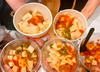 在周边社区考察后,实践团解锁特色体验——品尝米豆腐。钟同学、田同学介绍,米豆腐是秀山极具代表性的小吃,以大米为原料,经磨浆、熬煮、冷却等工序制成,搭配特质酱料、葱花、香菜等,口感爽滑、滋味独特,是当地人童年记忆里的美味。成员们围坐品尝,感受米豆腐在味蕾间散开的清香,听二人讲述米豆腐背后的民俗故事,比如节庆时吃米豆腐的习俗,以及它如何作为日常美食陪伴一代又一代孩子成长,体悟民族饮食文化对儿童成长的滋养。