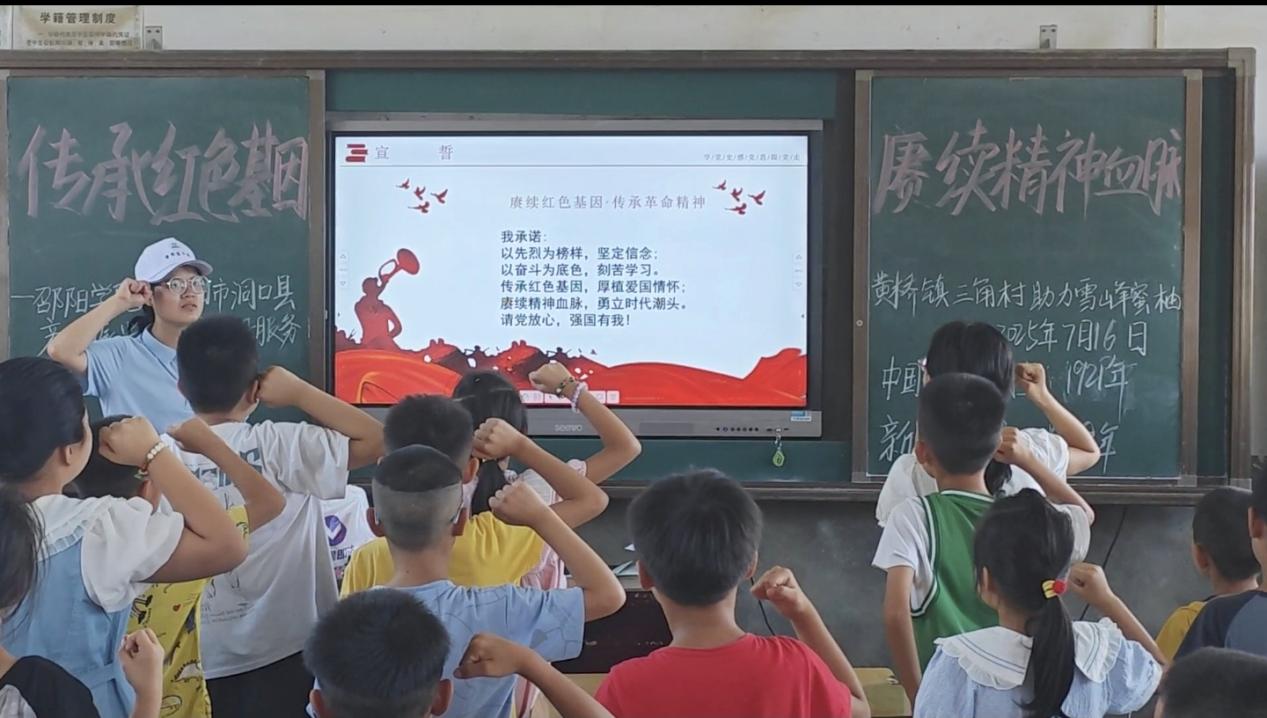 观影结束后,队员带领孩子们手持国旗,共同唱响《我和我的祖国》《五星红旗迎风飘扬》等歌曲。红歌润童心,激荡爱国情,孩子们激昂的旋律传递着对祖国的热爱,歌声让爱国情怀在乡村课堂里热烈涌动,随后,团队成员开展了以“青春领誓,点燃红色火种”为主题的宣誓活动。教室里,队员与孩子们共同高举右手庄严宣誓,孩子们高声“请党放心,强国有我”这一誓词,铿锵誓言传承着红色信仰。活动尾声,孩子们在观影中中厚植爱国情怀,在行动中根植赤子之心,不断筑牢三角村红色文化教育根基。