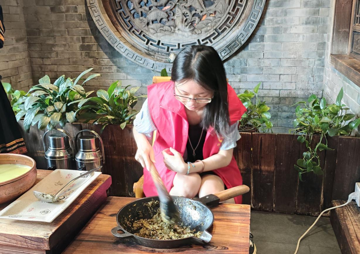 第三站团队成员走访恭城瑶族自治县民族产业展示中心。与非遗恭城油茶县级传承人刘老师深入交流,与刘老师回溯了恭城油茶的历史与文化价值,并现场展示了传统打油茶技艺,实践团成员纷纷上前尝试,体验油茶制作技艺。针对恭城油茶非物质文化遗产传播困境展开讨论,提出“科技+研学”的传承新思路,团队与刘老师探讨了“恭城油茶+亲子旅游”方案,提议打造恭城油茶手工坊,让孩子在体验中培养文化兴趣,助力瑶族非遗在青少年中重焕光彩。
