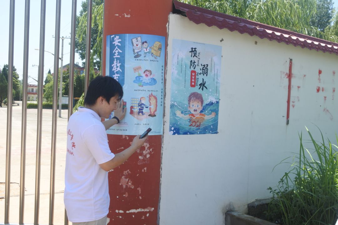图为实践队成员在淅川县老城镇初级中学校大门口张贴安全教育海报。陶玉麟供图