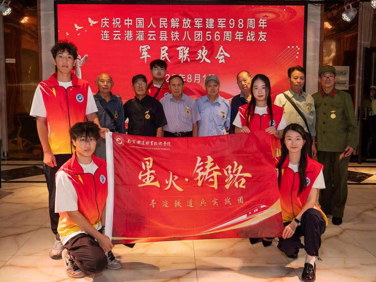 火红的八月,军旗飘扬。在建军节来临之际,南京铁道职业技术学院“星火・铸路”寻迹铁道兵实践团奔赴连云港灌云县,协助筹备中国人民解放军建军98周年暨连云港铁八团56周年战友军民联欢会,与铁道老兵们共忆峥嵘岁月,传承铁道兵精神。
