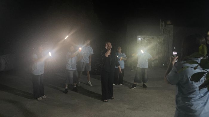 教学告一段落,音乐响起,实践队员们排好队形,为村民们献上合唱《我和我的祖国》。虽然并非专业水准,但那份青春的真诚与热情,深深感染了在场的每一个人。不少村民轻声跟着哼唱熟悉的旋律。唱罢,队员们没有停下,主持人笑着宣布:“现在,我们要向安山村的老师们学习啦!”接着,队员们略显生涩但满怀敬意地唱起了白天刚学会的那几句当地山歌调子。熟悉的乡音旋律从大学生口中唱出,瞬间点燃了全场的热情。几位会唱的老人情不自禁地站起来,接着唱了下去,歌声悠扬,回荡在夏夜的山谷。这一刻,语言的隔阂仿佛消融,只剩下旋律传递的共同情感。
