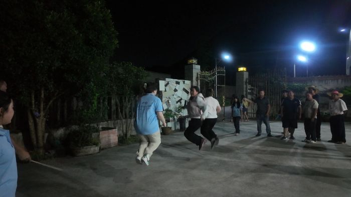 跳绳比赛将气氛推向高潮。长长的麻绳甩动起来,“啪啪”地敲打着地面。孩子们身轻如燕,一口气能跳几十个,用普通话大声数着“1!2!3!……”。几位大叔也来了兴致,笨拙却努力地尝试,跳得气喘吁吁,数数声引来善意的哄笑和鼓励的掌声。整个小广场沸腾了,笑声、欢呼声、数数声、歌声、绳子的甩动声交织在一起,汇成安山村这个夏夜最动人的交响曲。