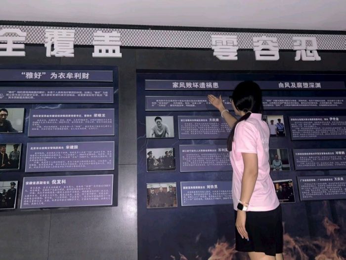 图为团队成员在廉洁警示展区学习,了解贪腐案例以明鉴
