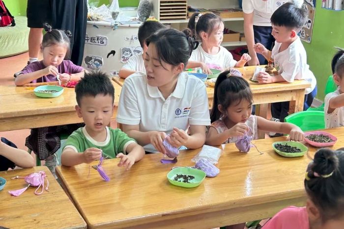 实践队来到枣庄明德幼儿园,以“奇妙中药大发现”为主题,带领孩子们认识生活中的中药“朋友”。圆润的莲子常伴粥饭,透明的蝉蜕来自树梢,毛茸的辛夷似小花帽,原来这些熟悉的物件竟是中药!队员江昊阳同学用趣味故事讲解了生活中常见中药的功效,红果山楂是揉散“吃撑皮球肚”的肠胃按摩师,金银花变作扑灭“喉咙小火苗”的灭火器,蝉蜕成为赶跑疹子的身体小管家。孩子们兴奋动手,将驱虫紫苏、安神白芷装入缝制好的香囊。有一个小朋友大声说要帮奶奶锁住膝盖的“风湿怪兽”,让小朋友在药香漫染间初识传统文化。