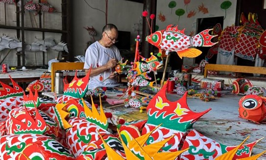 实践团午间赴瞻淇村调研,深入古村寻访非遗渔灯制作人。成员现场观摩渔灯制作流程,并通过传承人的讲解,系统的了解了鱼灯发展历史,辨析瞻淇村与汪满田渔灯的地域特色差异。此次实地考察深化了团队对传统渔灯文化独特价值的认知。