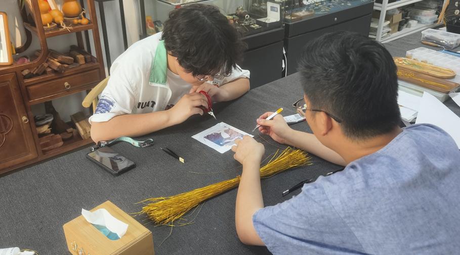 团队成员乐文俊在包钦指导下体验掐丝:镊子夹着铝丝颤巍巍折出弧度,屏息将釉料滴注到位,指尖的每一丝抖动都考验着耐心与精度。“以前觉得非遗是博物馆的展品,现在才知它有温度、有生命。”乐文俊的感慨,道出了团队的共鸣——非遗不仅是技术,更是一场文化修行。