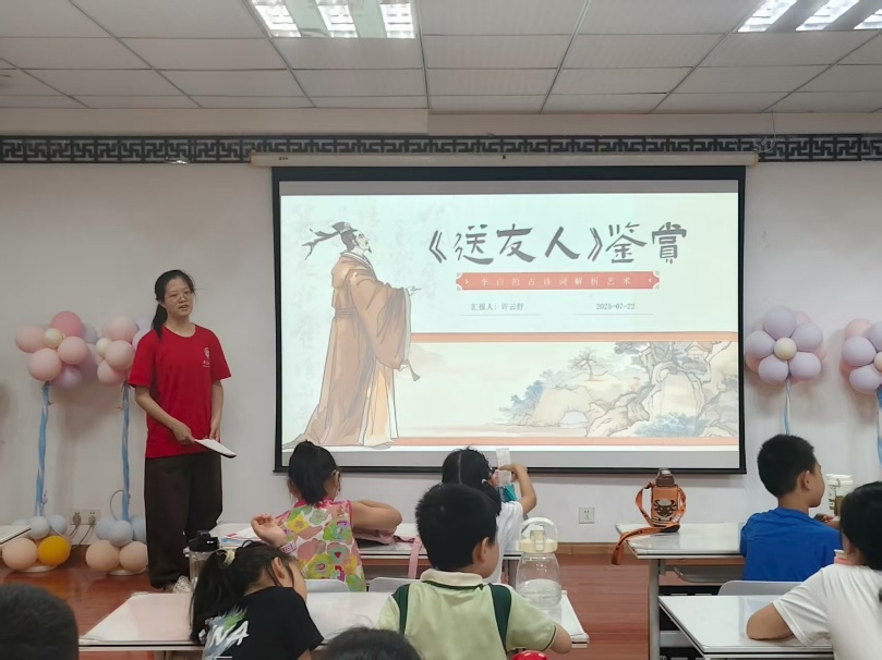 大学生志愿者充分发挥特长,精心准备了古诗鉴赏课,分享了唐代诗人李白的《送友人》的创作背景,引导孩子们赏析“青山横北郭,白水绕东城”“浮云游子意,落日故人情”等经典名句的意象之美与情感之深,解读诗人与友人依依惜别的真挚情谊。课堂上,志愿者组织孩子们集体朗诵,指导诵读的节奏与情感表达,并鼓励大家分享自己对友情的理解。通过这堂精心准备的古诗课,为孩子们开启了一扇感受古典文学魅力的窗口。