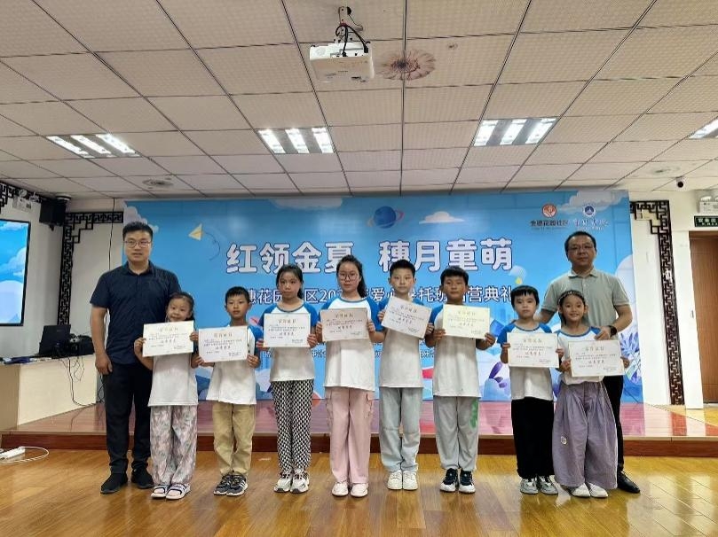 8月1日下午,在暑托班圆满结束之际,一场温馨而隆重的结业仪式在金穗花园社区活动室举行。仪式在孩子们充满活力的集体舞表演中拉开序幕,整齐的动作和灿烂的笑容展现了20天来的成长与自信。随后,南审泽园书院志愿者代表张歆苒同学上台发言,深情回顾了与孩子们相处的点滴,分享了作为志愿者的感动与收获,并代表全体志愿者表达了对孩子们未来美好成长的祝福。仪式上还穿插了精彩的小学生才艺展示,赢得了现场观众的阵阵掌声。最具仪式感的环节是证书颁发仪式,金穗花园社区党委书记刘林、南京审计大学泽园书院团委书记靳渊博及暑托班班主任老师等共同为30名圆满完成暑托班活动、表现优异的孩子们颁发了才艺之星和结业证书并合影留念。