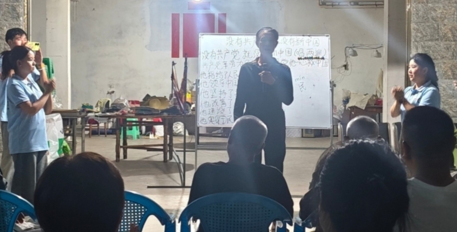 活动于夜幕中启动。实践队首先通过讲述党的历史事件,帮助村民唤醒红色记忆;随后进入核心环节,同步推进普通话教学与红歌学唱——以《没有共产党就没有新中国》为教学曲目,队员用标准普通话领唱,针对“持(chí,翘舌音)”“战(zhàn,翘舌音)”等村民易混淆的发音,逐字拆解示范,细致讲解边音、鼻音等发音规范,助力村民精准掌握。