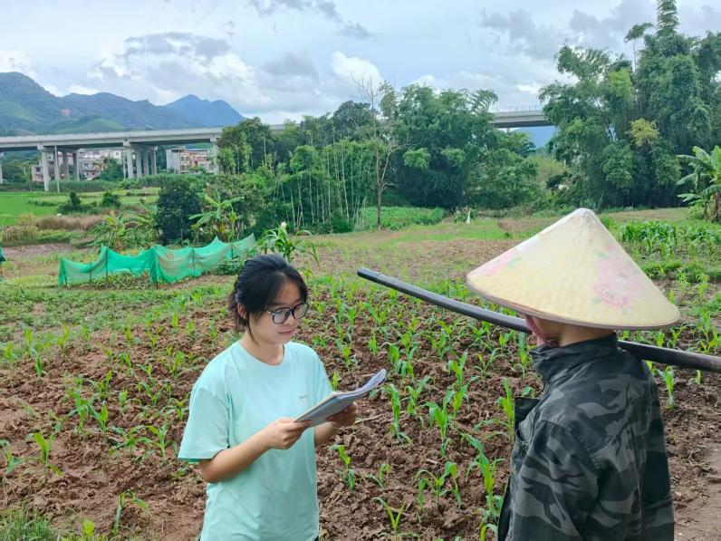 图为团队成员在广西崇左对农户进行采访 许雯婷摄